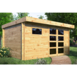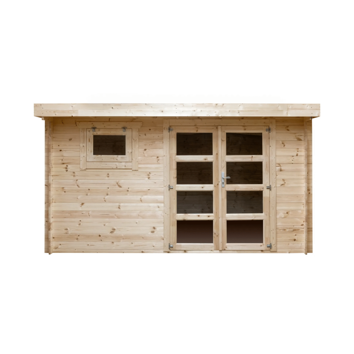 Son design moderne avec toit plat et ses madriers en bois massif de 28 mm d’épaisseur garantissent à la fois esthétisme et robustesse. Ses dimensions intérieures de 364 x 274 cm permettent une organisation optimale, tandis que ses dimensions hors-tout de 388 x 332 x 209,5 cm en font un abri spacieux et imposant.