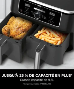 Chaque tiroir de 4,75L peut aisément contenir un poulet de 2 kg ou jusqu’à 1,4 kg de frites. Vous pouvez donc facilement préparer un repas complet composé d’un poulet rôti entier et de frites croustillantes, le tout dans un seul appareil et en servant le tout en même temps !