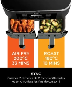 Grâce à la fonction SYNC, cuisinez des aliments différents dans chaque tiroir, avec des modes de cuisson, durées et températures différents, tout en synchronisant les fins de cuisson !