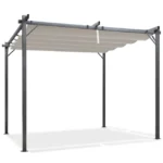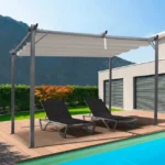 Profitez de nombreux moments dans votre extérieur grâce à la pergola taupe édition spéciale dotée d’un toit rétractable. Elle vous protège du soleil pour que vous puissiez profiter des belles journées ensoleillées. La pergola taupe toit rétractable s’adapte à vos besoins : vous pouvez créer un espace ombragé en tendant la toile ou au contraire, laissez passer les rayons du soleil en ouvrant la toile pour profiter d’un grand ensoleillement. Grâce à cette pergola édition spéciale dotée de stores, vous êtes certain d’être protégé du soleil ! Ajustez vos stores latéraux selon vos envies et disposez d’un ombrage supplémentaire, idéal pour un repas à l’abri du soleil. Votre pergola dispose de 4 stores afin de vous proposer le meilleur ombrage possible. Deux d’entre eux mesurent 120 CM x 225 CM et les deux autres stores mesurent 170 CM x 225 CM. Pour un ombrage optimal, nous vous conseillons d’installer les stores de 120 CM sur la largeur de la pergola (3M) et les stores de 170 CM sur la longueur de la pergola (4M). Vous pouvez cependant disposer les stores comme vous le souhaitez. Grâce à une structure en métal gris foncé, cette pergola de 2.90 x 3.95 M vous assure stabilité et longévité. Robuste, la pergola se fixe au sol avec ses pieds de 50 x 50 mm. Conçue avec des matériaux de qualité, la pergola édition spéciale est équipée d’une toile 100% polyester 180 gr/m² pour le toit ainsi que de 4 stores enrouleurs 100% polyester 180 gr/m². N’attendez plus pour passer de joyeux moments en famille ou entre amis tout en profitant du soleil selon vos envies ! Conseil : En cas d’intempéries (pluie et vent), retirez la toile de sa structure afin de prévenir le risque de stagnation d’eau. Nous vous recommandons également d’enlever les stores enrouleurs de la structure de la pergola en cas de forts vents. Veillez à bien fixer la pergola au sol pour assurer une bonne stabilité.Dimensions de la pergola édition spéciale taupe 3×4 MDimensions globales : Longueur 395 cm x largeur 290 cm x Hauteur 220 cmDimensions des pieds : 50 x 50 mmDimensions des 3 poutres supérieures : H. 50 x l. 25 x ép. 0,7 mmToile (toit) 100 % polyester 180 gr/m²2 stores enrouleurs coloris taupe : largeur 120 x Hauteur 225 cm2 stores enrouleurs coloris taupe : largeur 170 x Hauteur 225 cmDistance entre les pieds : 257 / 362 cmColoris : taupeStructure en acierÀ monter soi-mêmeRetrouvez l’ensemble de notre gamme de pergolas sur notre boutique en ligne !