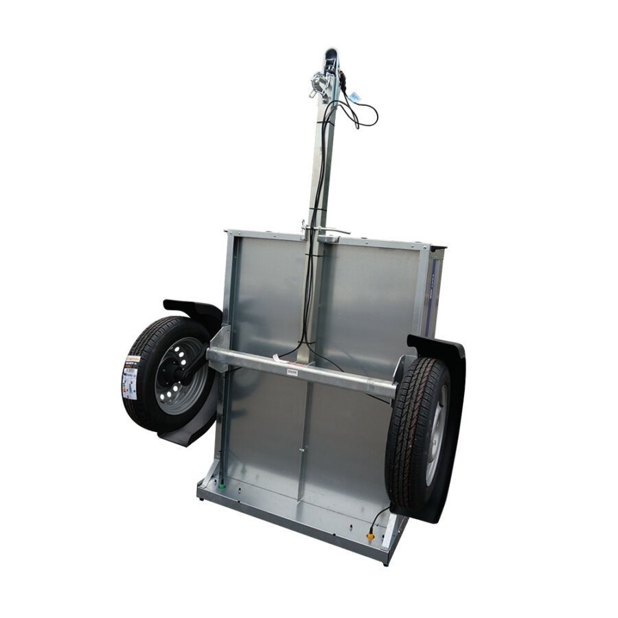 Cette remorque vous est livrée entièrement montée et possède des garde-boue en plastique, un timon droit, une ridelle arrière amovible et rabattable.