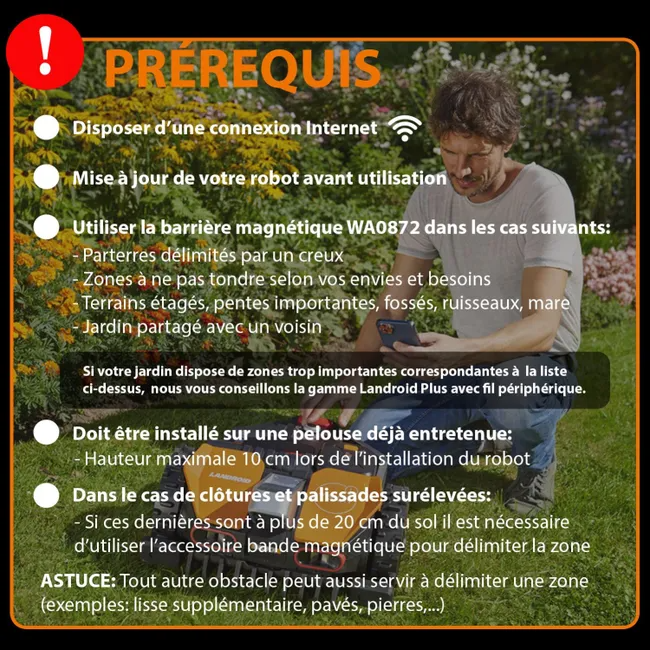 Imaginez : aucune configuration requise. Il vous suffit de prendre votre Landroid Vision, de l’installer sur n’importe quelle pelouse, d’appuyer sur le bouton de démarrage, et de le regarder faire son travail. Plus besoin de se soucier des câbles périphériques à poser, ni d’installer des antennes. Nous avons éliminé tous ces tracas pour vous.