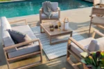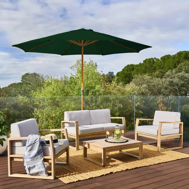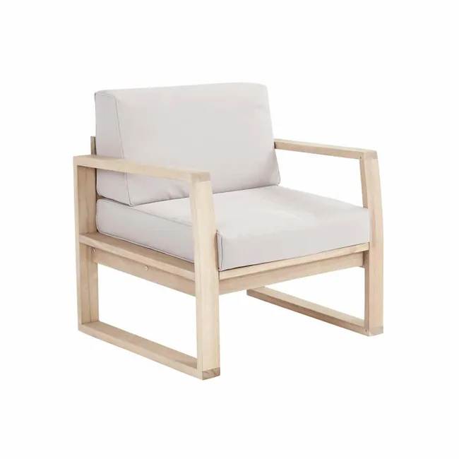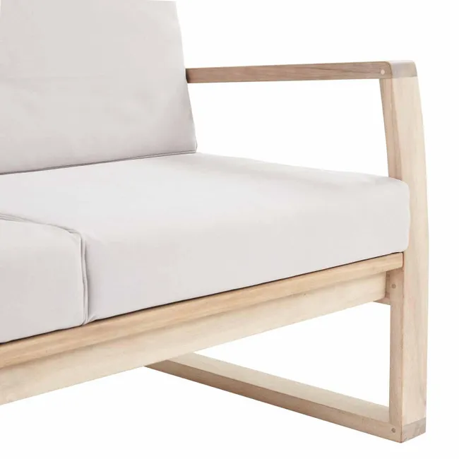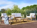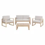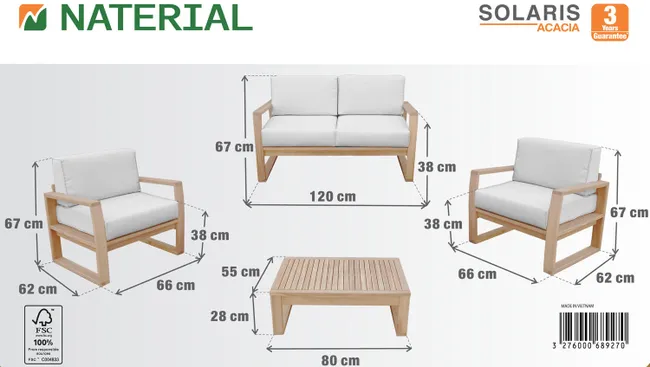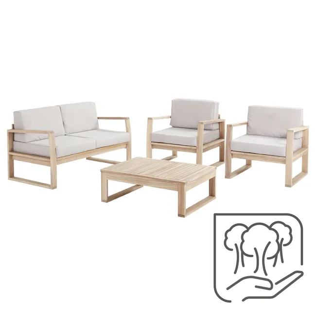 Le salon bas de jardin NATERIAL Solaris se compose d’un canapé 2 places, 2 fauteuils et une table basse. Il est fourni avec 4 coussins d’assise et 4 coussins de dossier tous déhoussables gris clair, en polyester imperméabilisé. Son piétement carré qui lui donne un look à la fois design et robuste, se coordonne parfaitement avec la table NATERIAL Solaris. Les gammes NATERIAL Solis et Solaris, avec lesquelles il se coordonne, sont en Acacia FSC. La finition huilée conserve l’aspect blond naturel du bois. Le label FSC permet de faire un choix éclairé vers des produits issus d’une gestion des forêts, écologiquement appropriée, socialement bénéfique et économiquement viable.