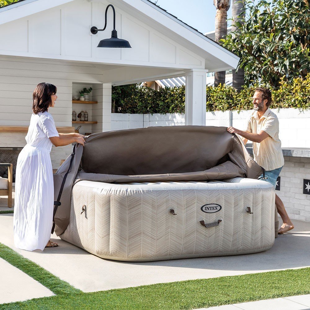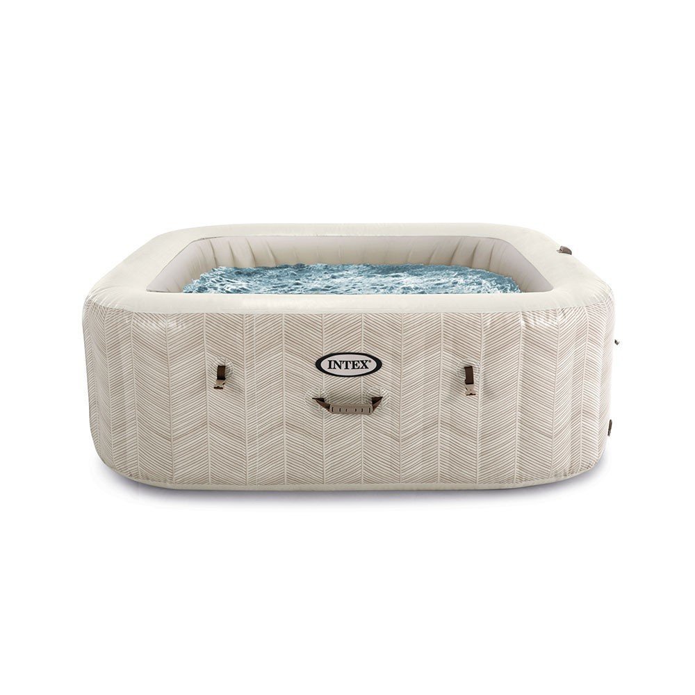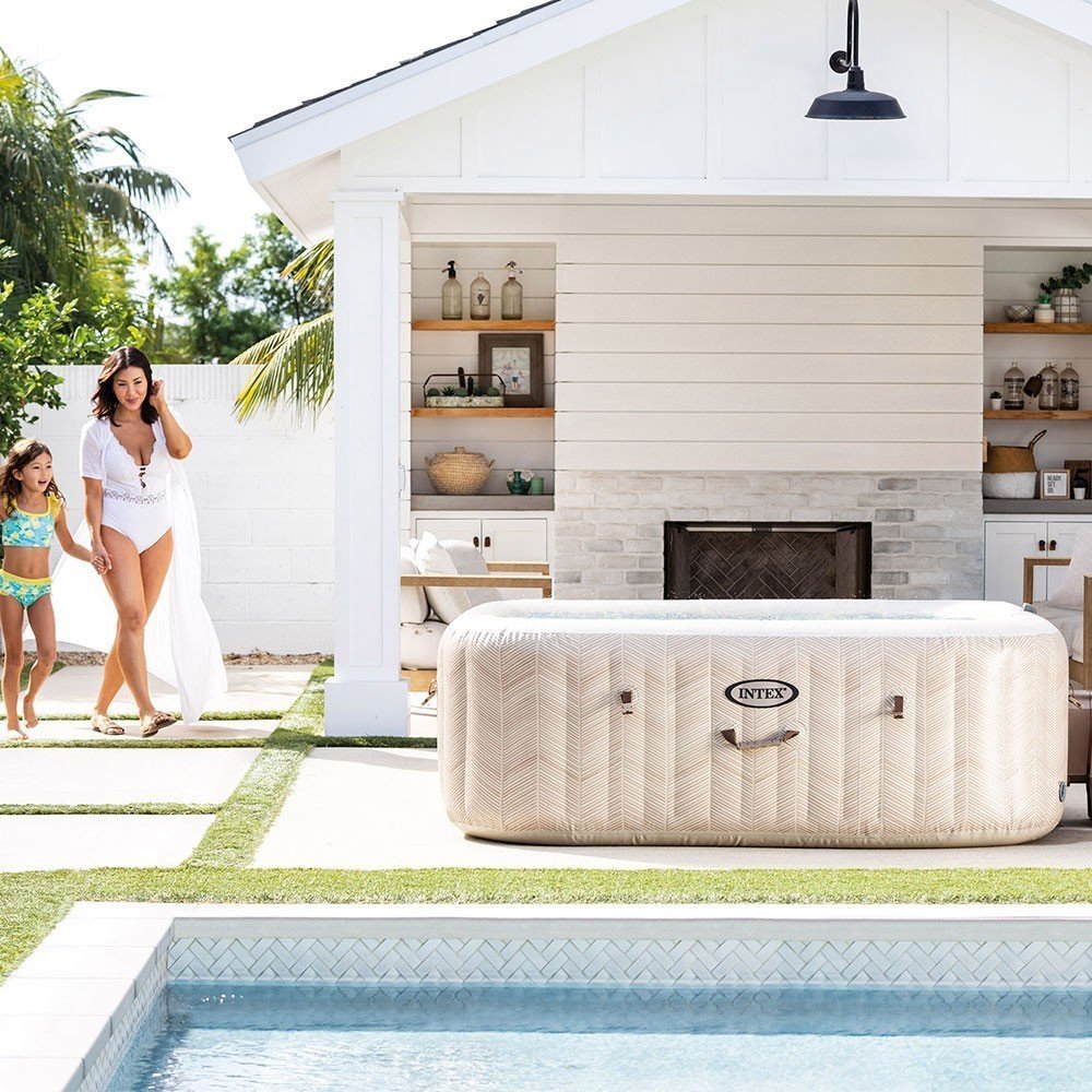 Le nouveau spa gonflable Chevron INTEX dispose d’un design épuré, d’une forme carrée pratique et d’un revêtement au motif ethnique s’intègrant parfaitement à tous les extérieurs.