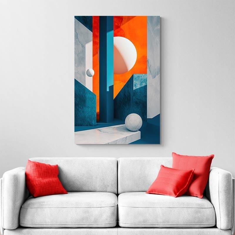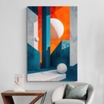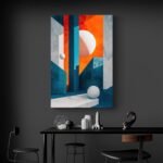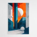 Ce tableau architecture abstrait orange et bleu mêle des formes géométriques et des couleurs audacieuses. Les contrastes vibrants entre l’orange éclatant et le bleu profond ajoutent une touche de modernité.