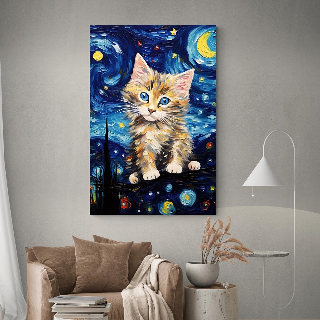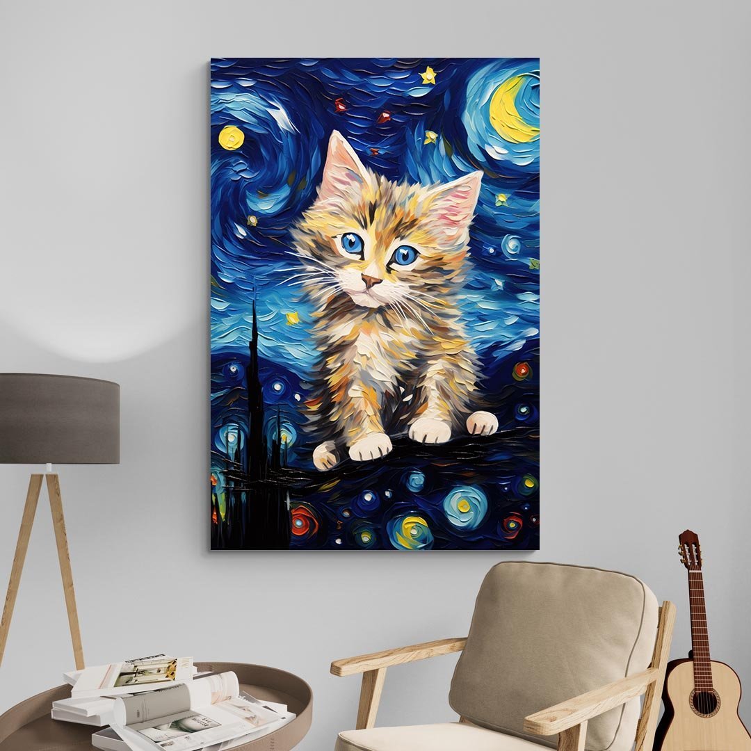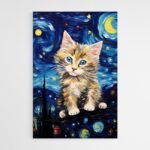 Ce tableau couleur chaton est une pièce charmante qui combine la douceur d’un jeune chat avec l’inspiration artistique d’un ciel nocturne vibrant.