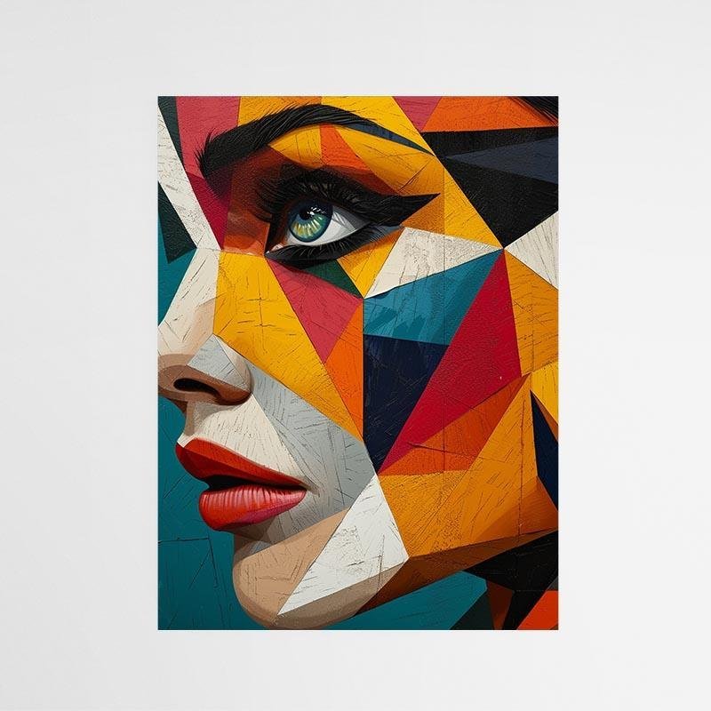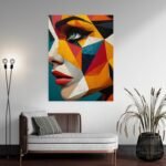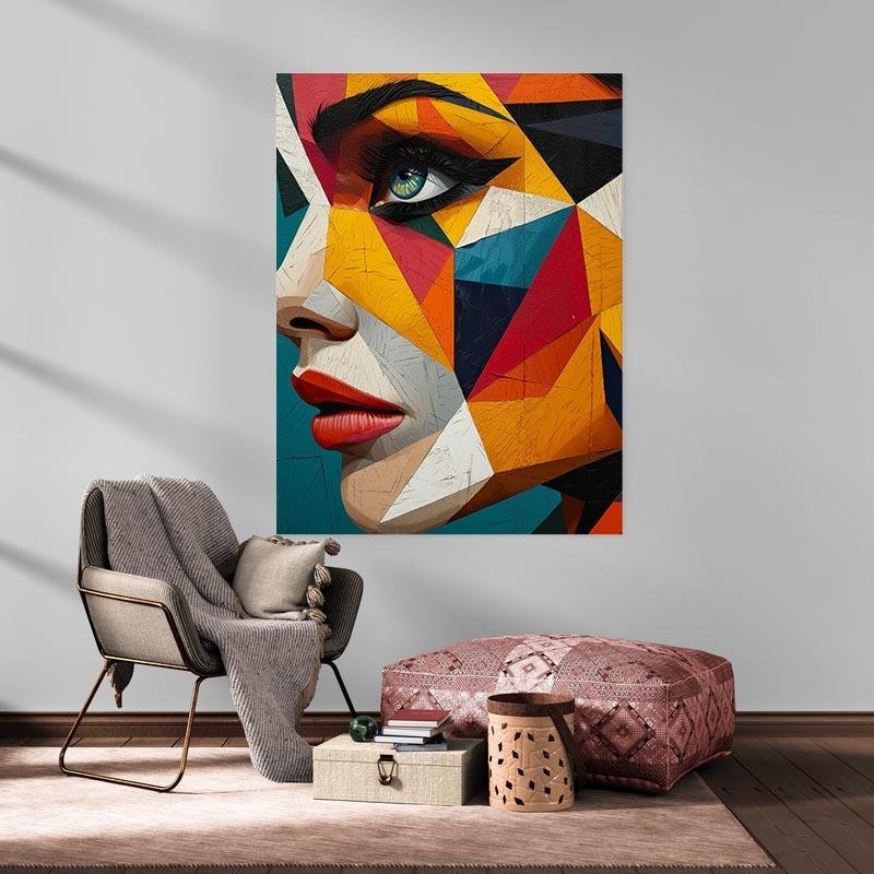 Pour un contraste saisissant, placez ce tableau sur un mur blanc ou gris. Les couleurs vives du Tableau visage femme cubisme coloré se marient parfaitement avec des meubles modernes et des accessoires en métal ou bois clair.